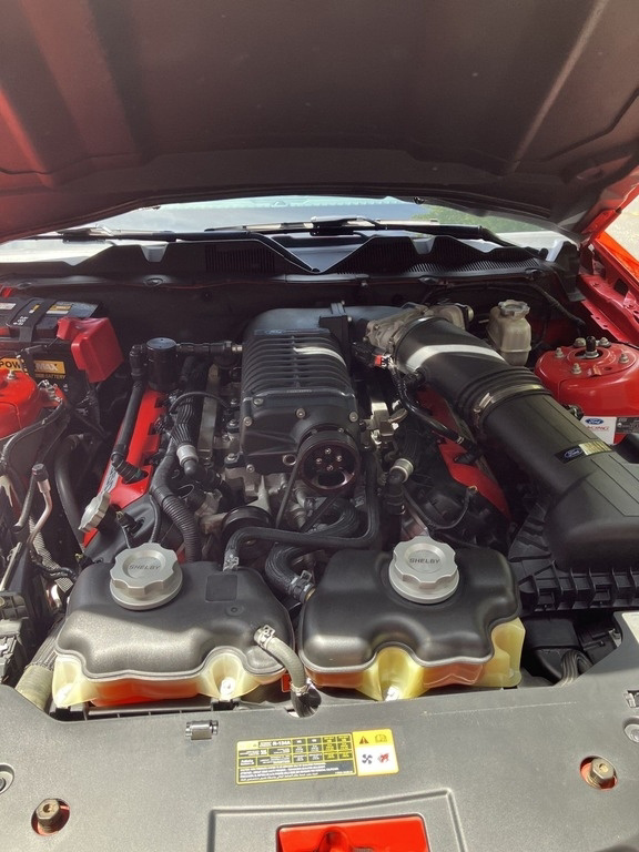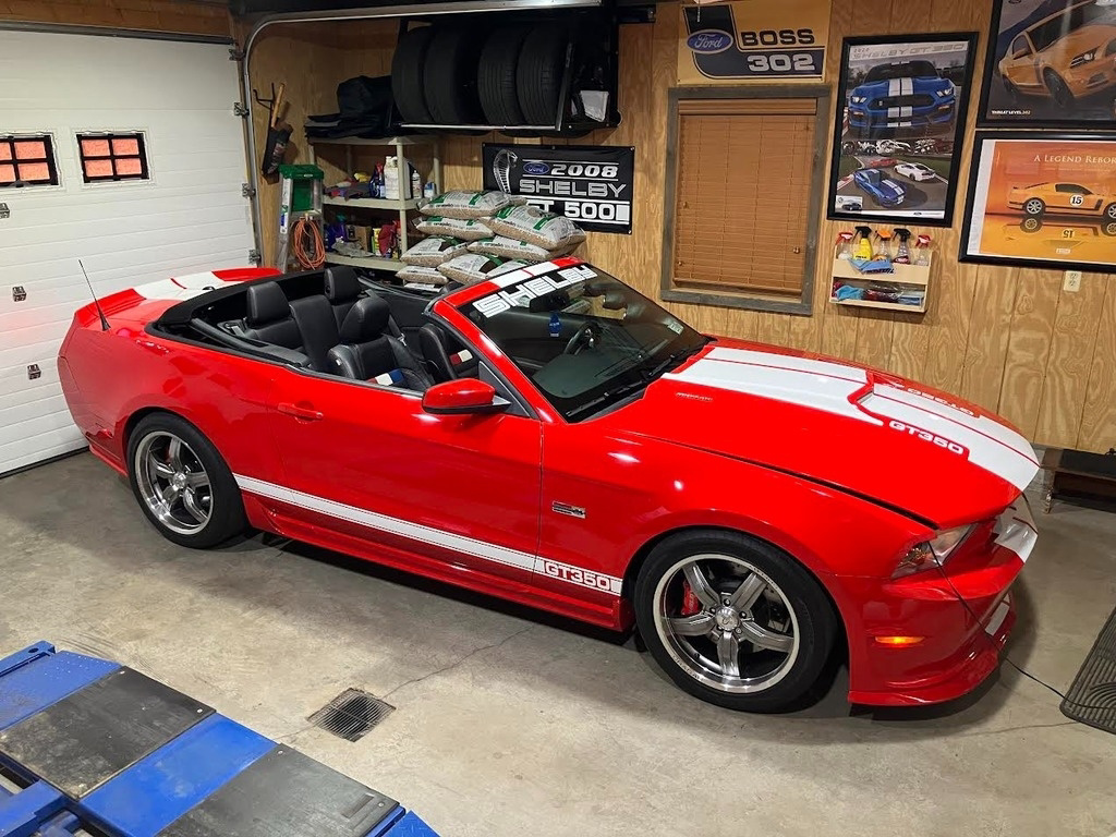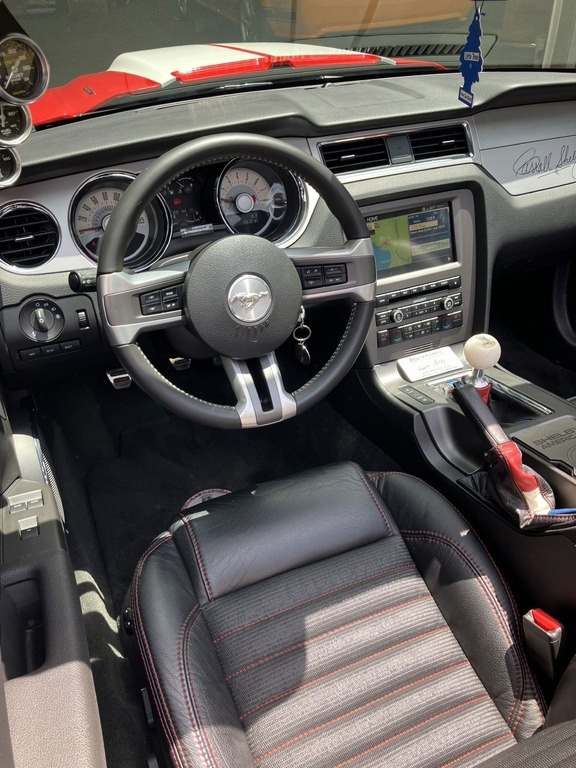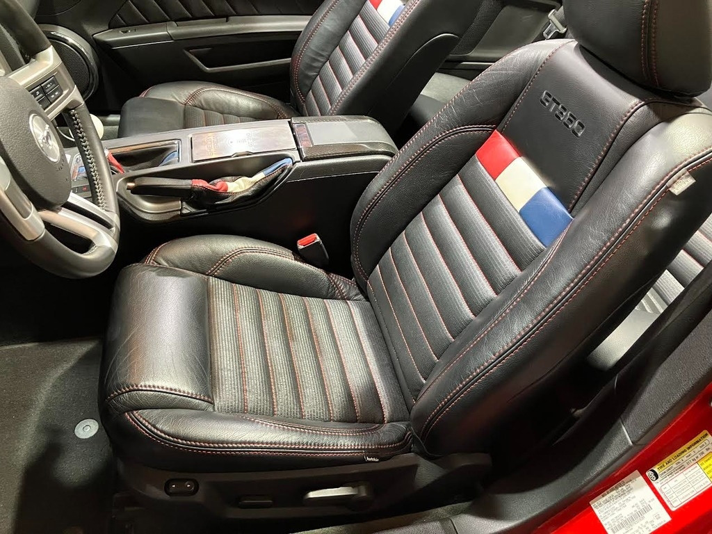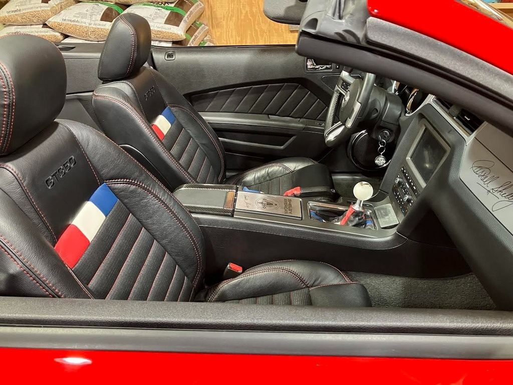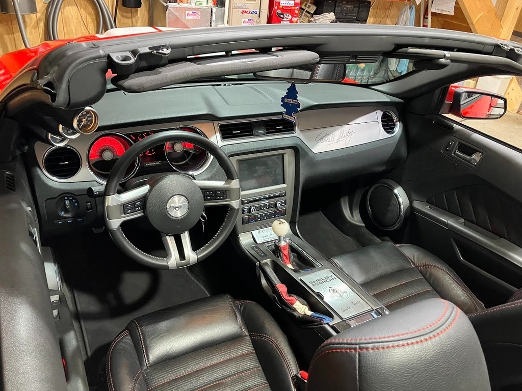 2012 Ford Mustang Shelby GT350 Convertible powered by a 5.0L V8 with upgraded 624 HP supercharger and 6-speed manual transmission, showing only 5,100 miles. Finished in Race Red with white racing stripes and charcoal black leather interior. Equipped with Wilwood rear brakes, Eibach suspension, 19" Cragar wheels, Borla center-exit exhaust, upgraded audio system, and power soft top. Rare, well-maintained performance convertible in excellent condition.
