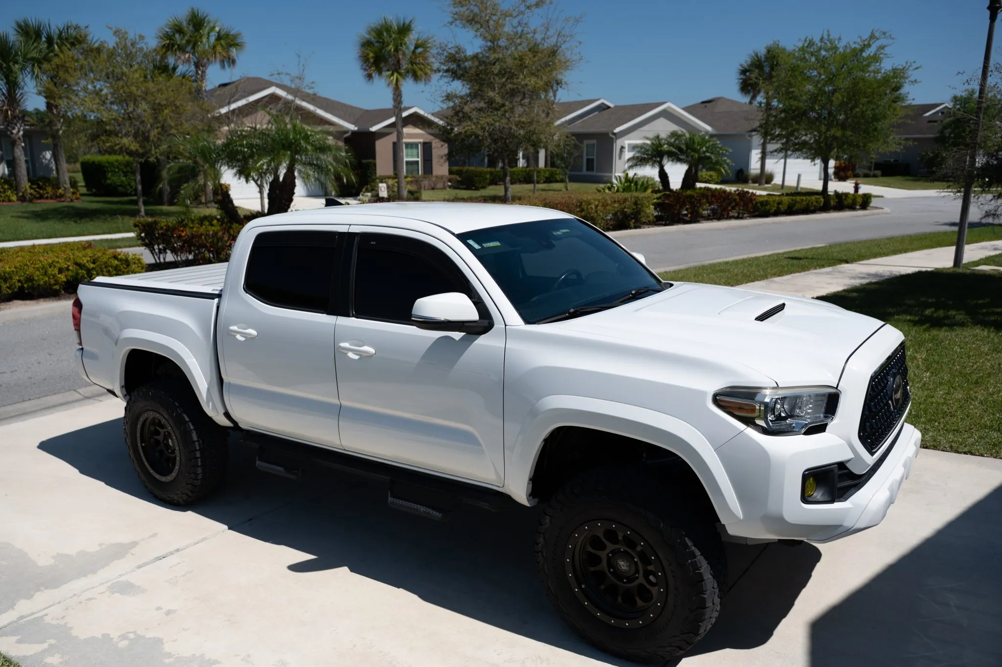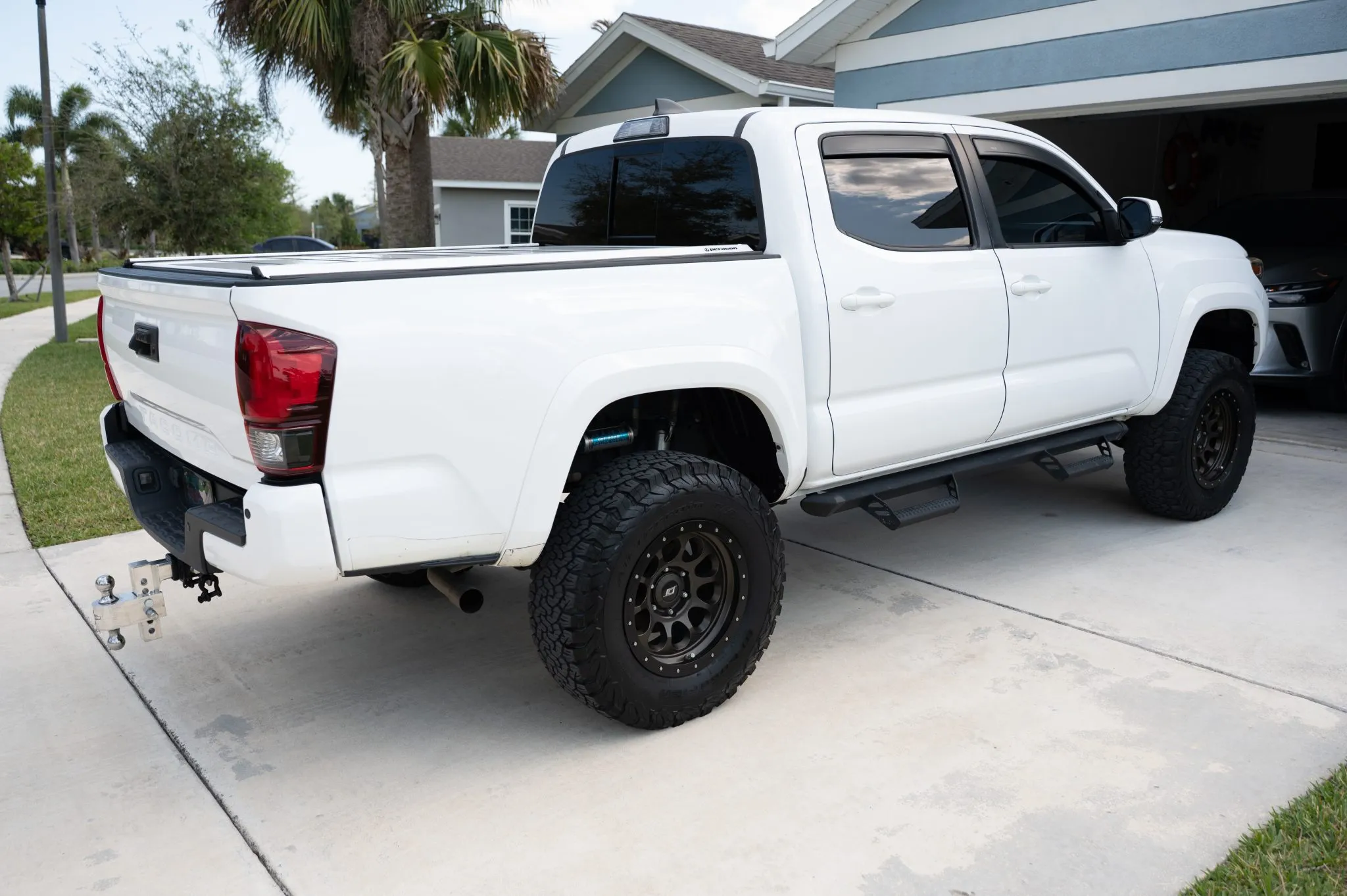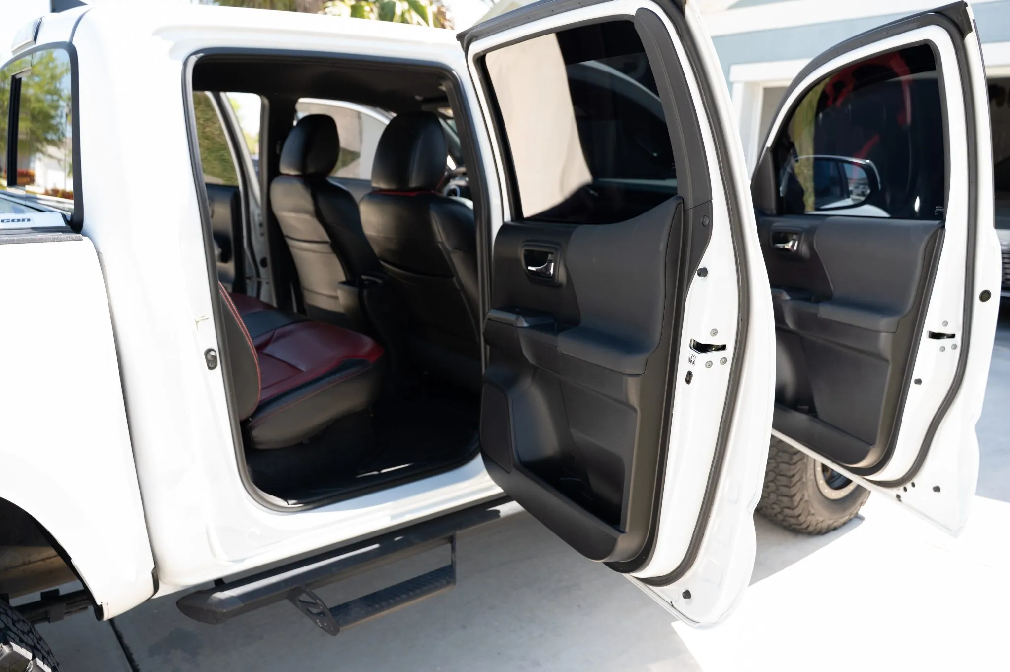 The Toyota Tacoma TRD Sport 4x4 Double Cab is a modified midsize pickup finished in Super White with black and red interior accents. Powered by a 3.5L V6 paired with a 6-speed manual and 4WD, it features a 3? lift kit, aftermarket wheels, limited-slip differential, and upgraded JL Audio sound system. Equipped with practical add-ons like a tonneau cover, bedliner, and side steps, this Florida-owned truck shows 84k miles and minor past damage on record.